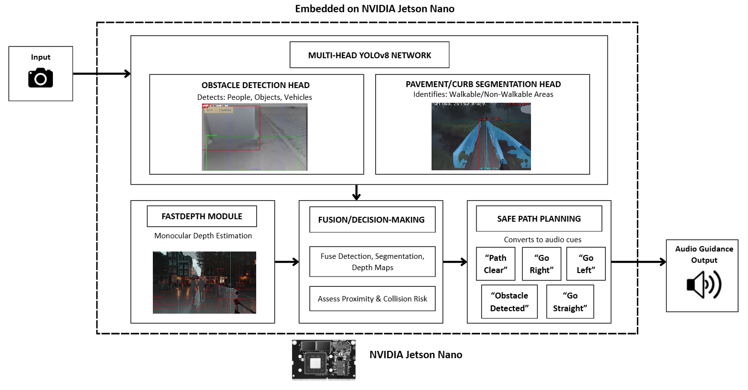 The visually impaired face severe mobility challenges due to reduced spatial awareness and limited real-time environmental understanding. Traditional aids such as white canes or guide dogs provide only local, static information and do not convey dynamic obstacle movement or path structure. This paper introduces PROXI-NAV, an embedded navigation assistance system that leverages a multi-head YOLOv8 architecture with monocular depth estimation to provide continuous auditory guidance. The system runs on an NVIDIA Jetson Nano, performing obstacle detection, pavement segmentation, and lightweight depth estimation in real time. Audio cues are generated from spatial reasoning over detected obstacles and depth maps, enabling safe, adaptive navigation through cluttered environments. Experimental evaluations demonstrate the system’s ability to generate low-latency, context-aware navigation instructions, outperforming traditional sequential pipelines by reducing latency and improving user situational awareness.